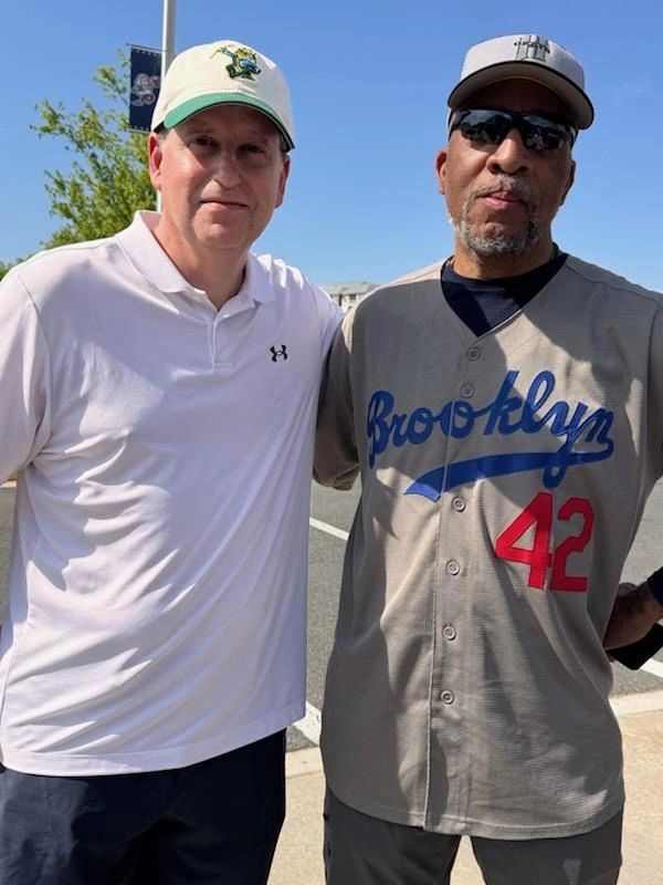 Standing on Jackie Robinson Way with Fredericksburg Nationals President Seth Silber yesterday minutes before the Nats took on Delmarva late morning at home. Silber and family were instrumental in bring minor league baseball to Fredericksburg and later recognizing latter day Spotsylvania Black Baseball teams amongst Virginia's best in recorded history. Here Seth donned a replicated Fredericksburg Frogs cap.